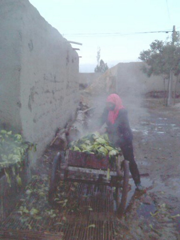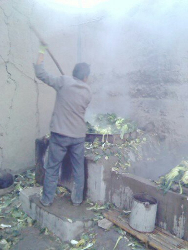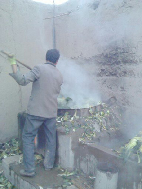 清晨五点多,我就听到门外面的大灶台上炭火烧得噼里啪啦,接着便是钢叉与铁锅碰击的声音。我迅速起床去看。只见邻居拿着钢叉在一个可以洗澡的大铁锅里翻菜,那一棵棵绿油油的白菜变的 更加娇艳欲滴 ,让人看了很有吃的欲望。