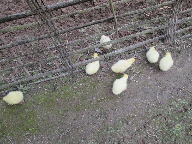 十只小鸭子中的九只都长地差不多, 颜色也差不多,当我感到很无聊的时侯,散步在乡间的小路上,鸭子们跟着我,找吃的去。当我停留在一个地方许久,欣赏风景的时候,鸭子们便会四处分散,用嘴在土里啄嫩草吃。