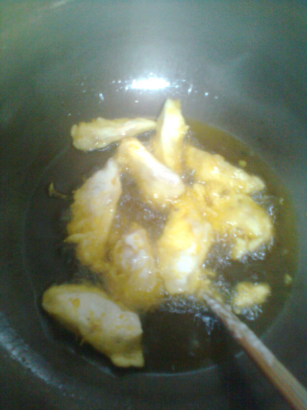接下来在锅中倒入少许的油,待油热了以后,把茄子放入锅中开始炸,过上一会儿就给它们翻个身,炸另一面,过上几分钟就关为小火,火候要把握得当,不然就炸焦了。不一会儿,整个厨房都是茄香味,我已经迫不及待地想要品尝一番了,但是茄子还没有熟,要等外面裹着的面糊变成金黄色才行。我站在旁边口水都差点流出来,终于等到炸茄子出锅了。