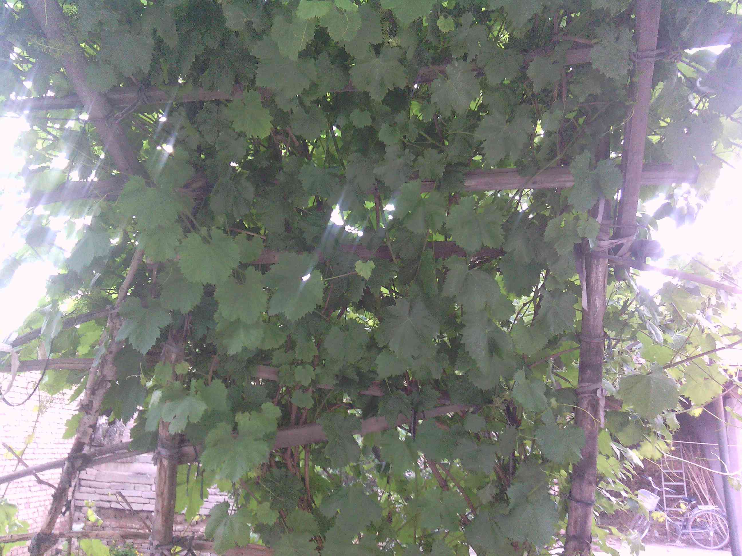 站在葡萄架下,抬头可见一片片叶子,好像向我招手。葡萄的叶子刚长出来时是嫩绿色的。过几天,叶子渐渐长大,就变成了碧绿色。现在葡萄架上结满了葡萄,很小,几乎看不到。天气很热时,把桌子搬到葡萄架下吃饭,风儿吹过来,感觉凉飕飕的,舒服极了!梨树像一位绅士,高高的,而且很笔直。今年结的梨很多。等到秋天,梨成熟了,不管是谁进来,都要顺手摘上一个尝尝。苹果树上也挂满了很多"小灯笼", 很招人喜欢,巴不得现在就是秋天。啊,秋天又有大丰收了。月季花可是这个家族中的"公主"。它是红色的,很像玫瑰,闻起来有一丝淡淡的香味,漂亮极了!