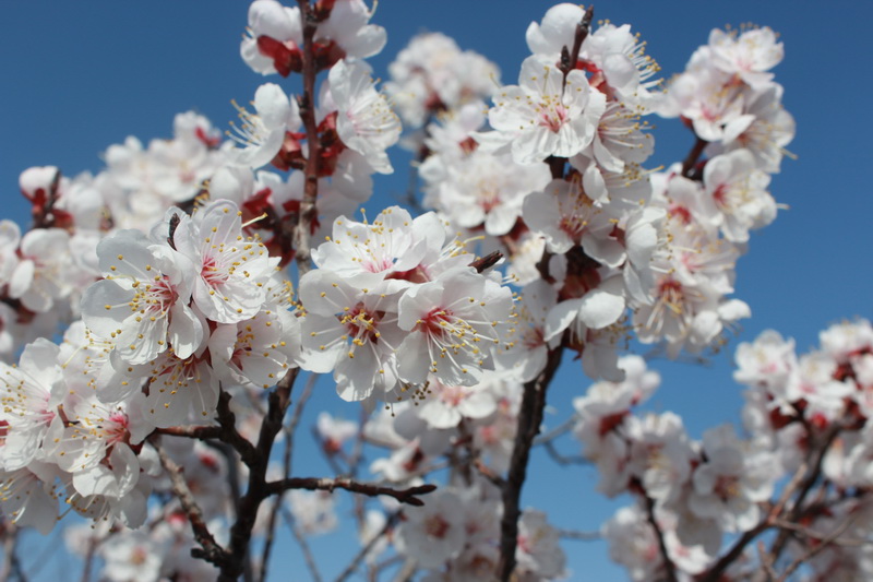 我一步步地向着茂密的杏树林进发。走近才发现,杏树长得毫无规律可言,只是肆意地向外伸展开来。那些淡粉色的小花则小心翼翼地挂在枝头上供人们欣赏,杏花开得千篇一律,都是小白花上留下淡淡粉色,只是一些还是小花苞,有的花却早已调谢。