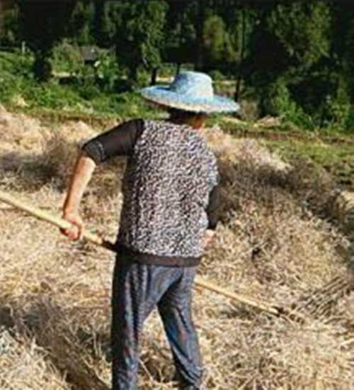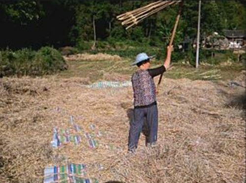 我叫了声"奶奶",她回过头来答应着我,并叫我帮她端杯水来。她放下手中的链架,走到田坎边上的树荫里坐下,接过水杯就咕咚咕咚地灌上一气。然后她一边揩着汗水,一边对我说,今天天气好正好打菜籽,叫我一会儿也帮她干干活儿。