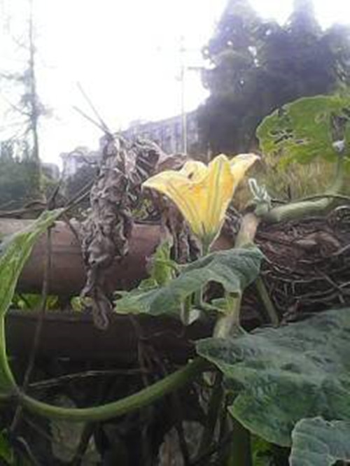 一天早上,我来到地里居然发现了几朵黄色的丝瓜花,金黄的花朵有的直直向上,有的从架上垂下来,看上去就像一个个黄色的小喇叭似的好看极了。金黄的丝瓜花在绿油油的藤蔓的映衬下,远远望去又像一幅色彩凝重的西洋画。