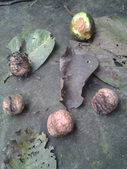 等到核桃果的表皮由翠绿变成暗黑时,核桃便迫不及待地挣脱外皮的束缚,跳到地上来了。这时候,我们偶尔也能捡到几颗核桃解馋,但是那怎么能满足我们的胃口?于是我们决定用棒子打核桃。