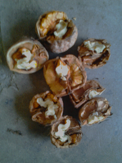 弟弟迫不及待地把核桃捧回家,又找来一个小榔头。他先剥去核桃外皮,再用榔头一砸,核桃壳裂开了,露出雪白的核桃肉。我们从核桃壳里出去核桃肉,喂在嘴里美美地吃着,味道这是鲜美极了!