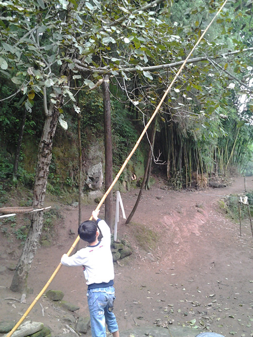 我们先找来一根约四米长的竹竿,绕到核桃树下,可弟弟却要抢着打。他那瘦小的身子怎么能承受得住四米长的竹竿的分量嘛,但见竹竿在他手里乱晃,我便顺势抢过竹竿来,使劲一挥朝一颗核桃敲过去。谁知用力太猛,重心偏离棒子敲在了几片核桃叶上。那几片核桃叶在我的摧残下,惊慌失措的掉在地上,静静地躺在那里好像嘲笑我似的。我不甘心,用敲了几下,可都没有核桃掉下来。这时,弟弟提议在竹竿尖上绑一把镰刀,用镰刀割应该能把核桃弄下来吧。