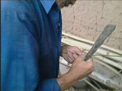 其次是育架子。到山坡上砍那种约大拇指大小长得笔直树条(最好是柏树),去除小丫枝,然后用火烤树条,烤到树条变软时,再把它完成弯弓形。这是力气活儿,但也要掌握好火候,不然的话会前功尽弃弄断树条的。然后用篾条把两端拴住定型。育好架子便可以编撮箕了。