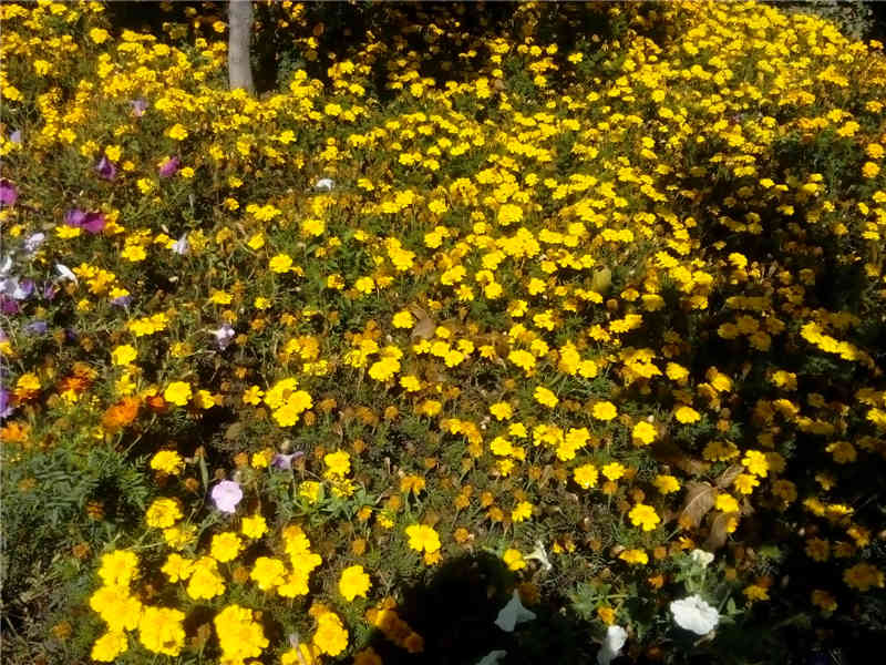 看,一大片黄色的菊花,稠稠密密的。满园就它最抢眼,朵朵开的不相上下,闻着香香的,真想摘一朵在手,但不忍摘下,只能欣赏一番了。但不凡有几株白色的粉色的喇叭花点缀在其中,也不逊色。