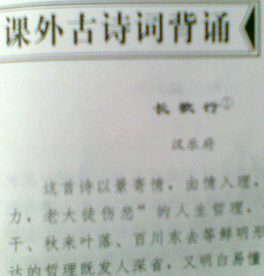 我的语文书还有课外古诗词背诵。这样既丰富了知识,又提升了文学素养。优美的古诗词使人产生的美感是非常让人寻味的,有时会对其诗境产生憧憬,于是学习兴趣便会更加浓郁,诗中不仅有韵味,还有丰富的情感。如李白的"浮云游子意,落日故人情",用物来衬托出依依不舍的故人之情。