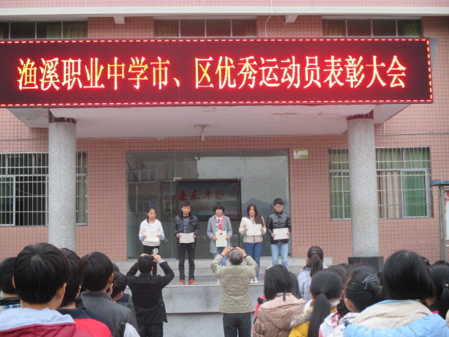 站在集合的位置上,上面显示屏出现了"渔溪职业中学市、区优秀运动员表彰大会"红色的大字。哦,我们明白了,这时学校又要表扬获奖的同学。学校领导在上面给我们介绍这次学校几个学生参加市区运动员的情况。说着说着就说到我们学习上来了,要求我们学习也要像这些获奖同学一样,努力拼搏,不怕吃苦,争取有优异的成绩为学校争光。