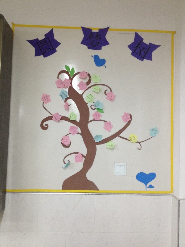黑板的两边分别是"班务栏"和"圆梦树",特别是"圆梦树",是每个同学对未来的美好期盼,他承载着我们的梦想。
