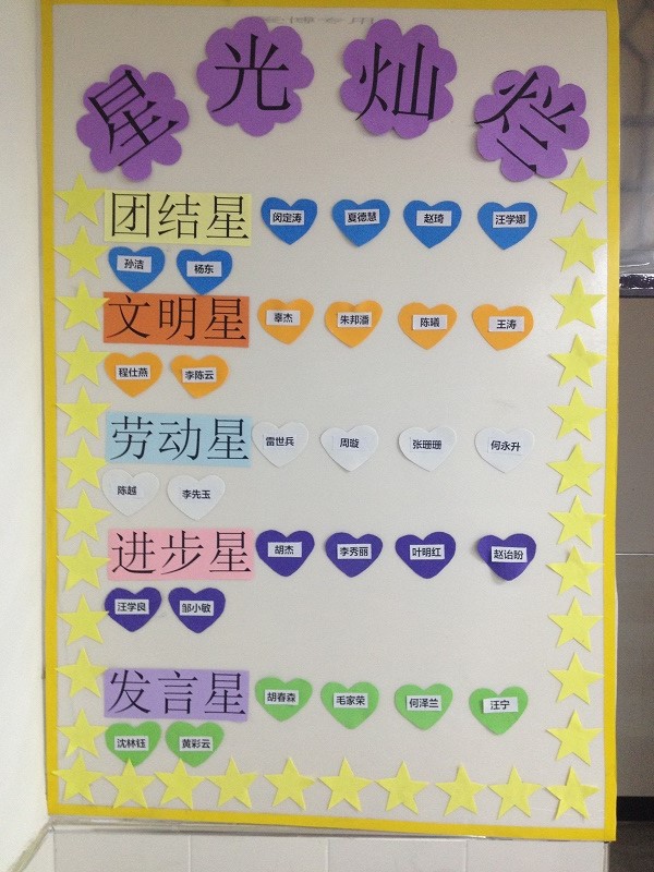 教室的两侧,是"卫生角","星光灿烂"和"班级公约","班级公约"是我们班级的公约,也是我们做人的公约,卫生角,提示我们班级的整洁靠每一个人的努力。