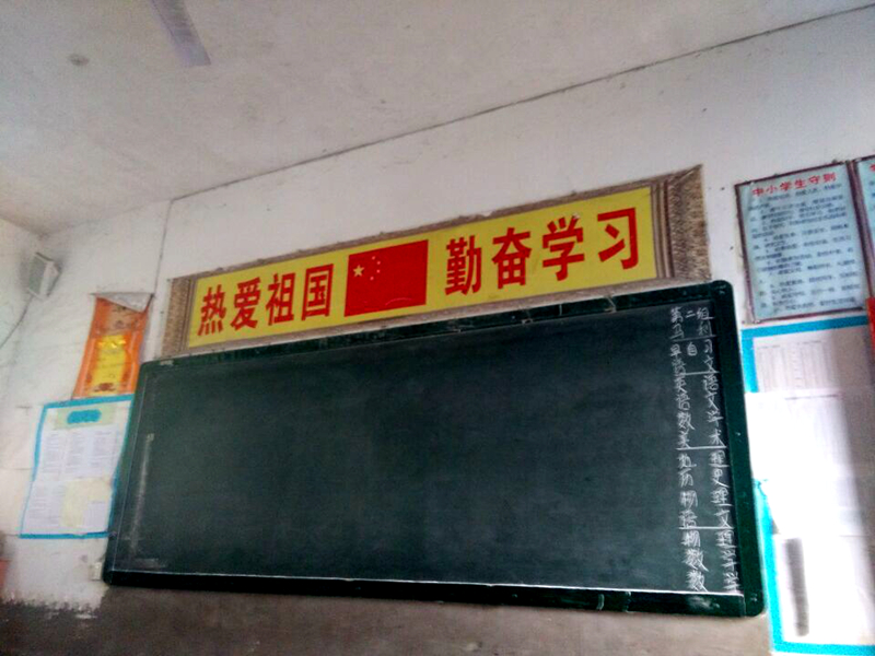 教室黑板的顶端挂着一条横幅,上面写着八个鲜红的大字"热爱新中国,勤奋学习",这八个字中间也有一面小小的五星红旗,显得庄严肃穆。因为老师给我们讲过,五星红旗是无数革命烈士用鲜血染红的,来之不易,它是我们新中国的象征,我们必须爱护它,尊重它。每天我们都把它擦拭得干干净净,一尘不染。