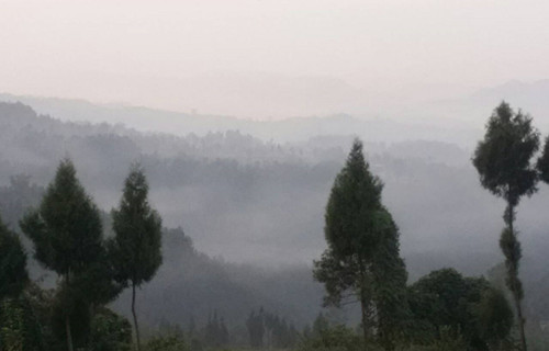 天空是灰蒙蒙的,太阳公公总是不肯露面。大地几乎每天都穿上朦胧的纱衣不舍得脱下。站在这边的山上向对面望去,那边的山峰若隐若现,朦朦胧胧,的确是挺好看。不过现在一入冬季,天气转寒,怕是没有谁会到这山峰上去欣赏风景。我也是周一去上学的时候偶然间看到的。