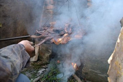 然后就可以熏肉了,但熏制是最讲究的。不能用的柴禾:1、不能用煤,煤烟使肉酸而糟味怪。2、不能用马尾松(枞树)包括松针,松烟油使腊肉不好洗,其肉味涩;3、不用桐子树、木梓树,桐子味辣,木梓褪油。4、忌塑料等一切有毒有异味的柴禾。最好的是:香柏枝叶,柑橘橙柚的皮,花椒胡椒,辣椒茎杆,红薯藤等。火势不宜过猛而又不间断。这样,色、香、味具成上品,达到温补而健美的效果。