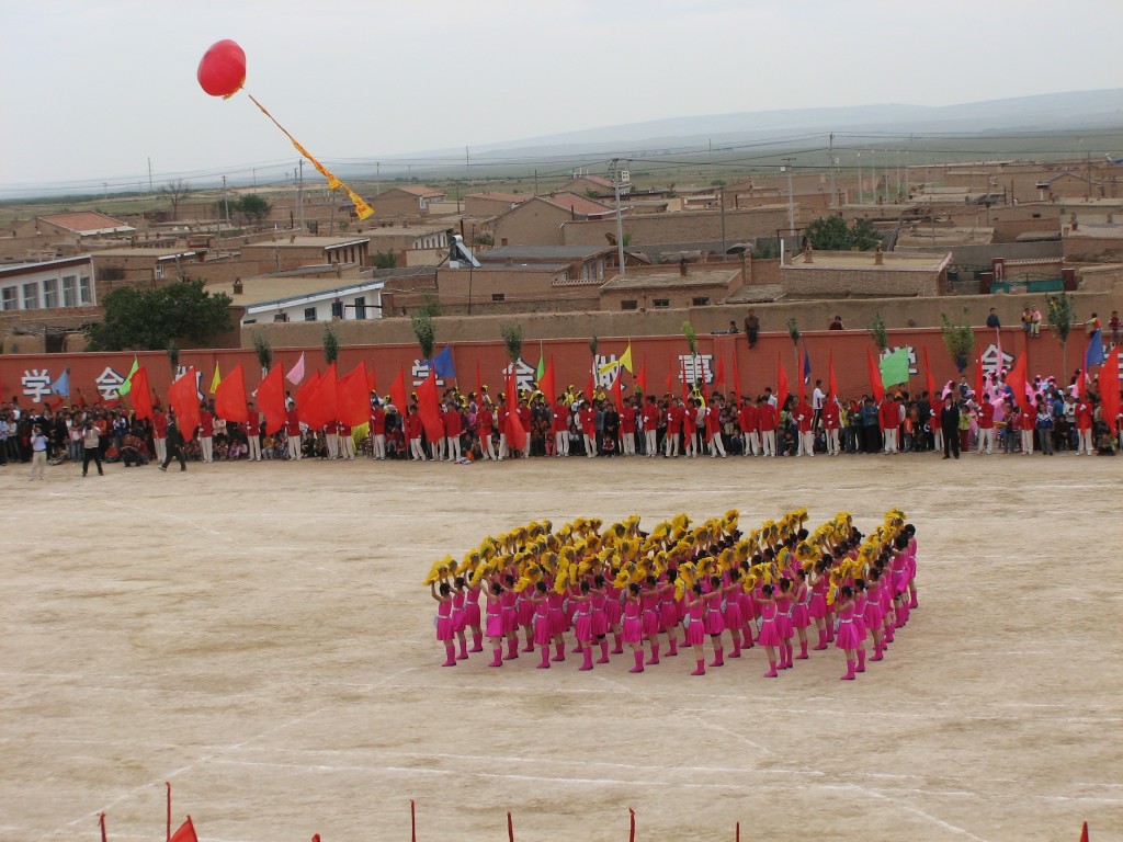 从上往下望,一会儿变成一朵朵拥簇在一起的向日葵群,我们像一只只小蜜蜂在向日葵群中采花蜜,一会又各自"飞"开,整齐的步伐,青春的激情被我们一一展现,台上、台下一阵热烈的掌声,虽然天有些冷,风有些大,但我们忘记了一切,尽情的跳着。