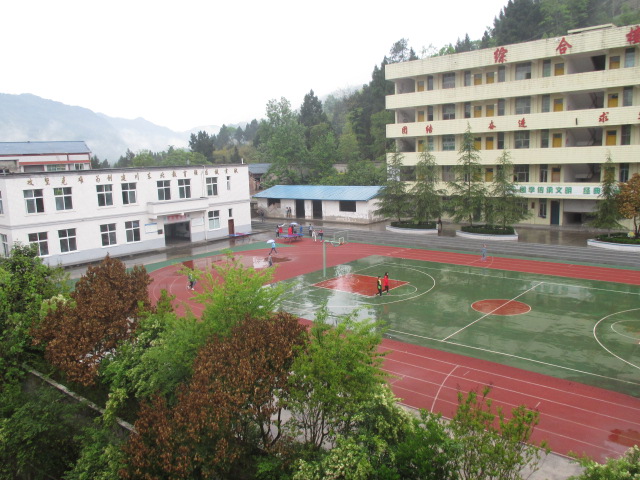 操场上,几棵高大的松树在雨后显得生机勃勃;还有我们学校的"篮球贩子" 在打篮球 。