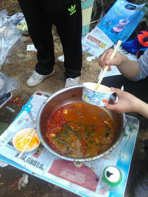 到了目的地,每个小组的组长开始分工了,因为我们将要自己在这山坡上做饭。他们有的负责打水,有的负责烧火,有的负责捡柴,有的负责做饭……因为我平时会做一些简单的饭菜,所以组长分配给我和两位同学的任务是做饭菜。今天中午我们组计划的是煮火锅,这对我来说还有挺简单的。首先,我们要烧水,大约过了半小时,水烧开了,我们急忙把火锅料倒入锅里,又隔了三四分钟,我们把要烫的食物全放进锅里,过了几分钟我们打开锅盖,只闻见一股香喷喷的、让人流口水的味道。就这样,我们中午的大餐就这样干了。