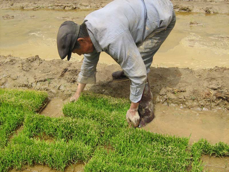 稻田整理好后,农民开始插稻秧,插秧有讲究,必须拉绳子,这样才可以使行与行之间的距离基本保持一样宽,行距确定了,就为以后的稻田除草、施肥、打农药等田间管理打下基础,