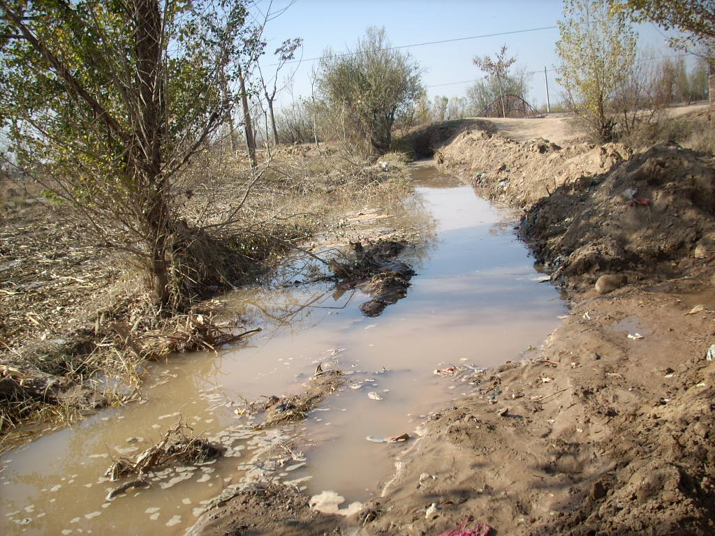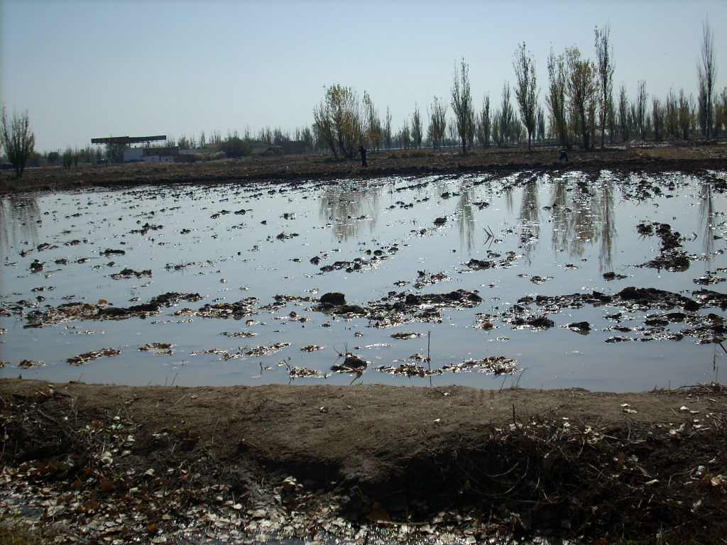 这是淌完冬水后的情景,土被水淹没了。十一月底,宁夏夜晚的气温达到了零下,水结冰,淌完冬水的田里,一夜之间,土地被冻住了,这样,水保存在土里,第二年春天,气温升高,冰融化,农民就可以播种。