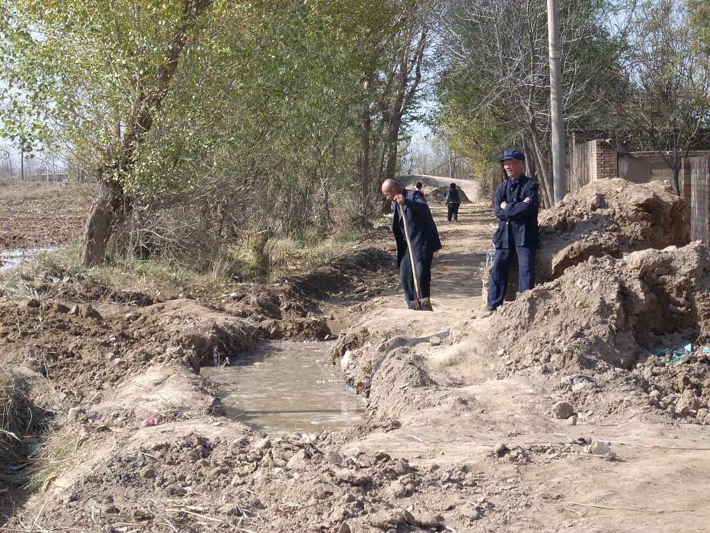 地犁了,平整好后,天气也变冷了,农民开始淌冬水,宁夏属于半干旱地区,冬水主要是黄河水,黄河水通过唐涞渠、黄渠等大型渠道流经宁夏平原。这是来自唐涞渠的水,渠水通过一条条小水渠灌溉到田里。淌冬水是为了给土壤保墒情,第二年春天,播种后,种子能及时发芽。