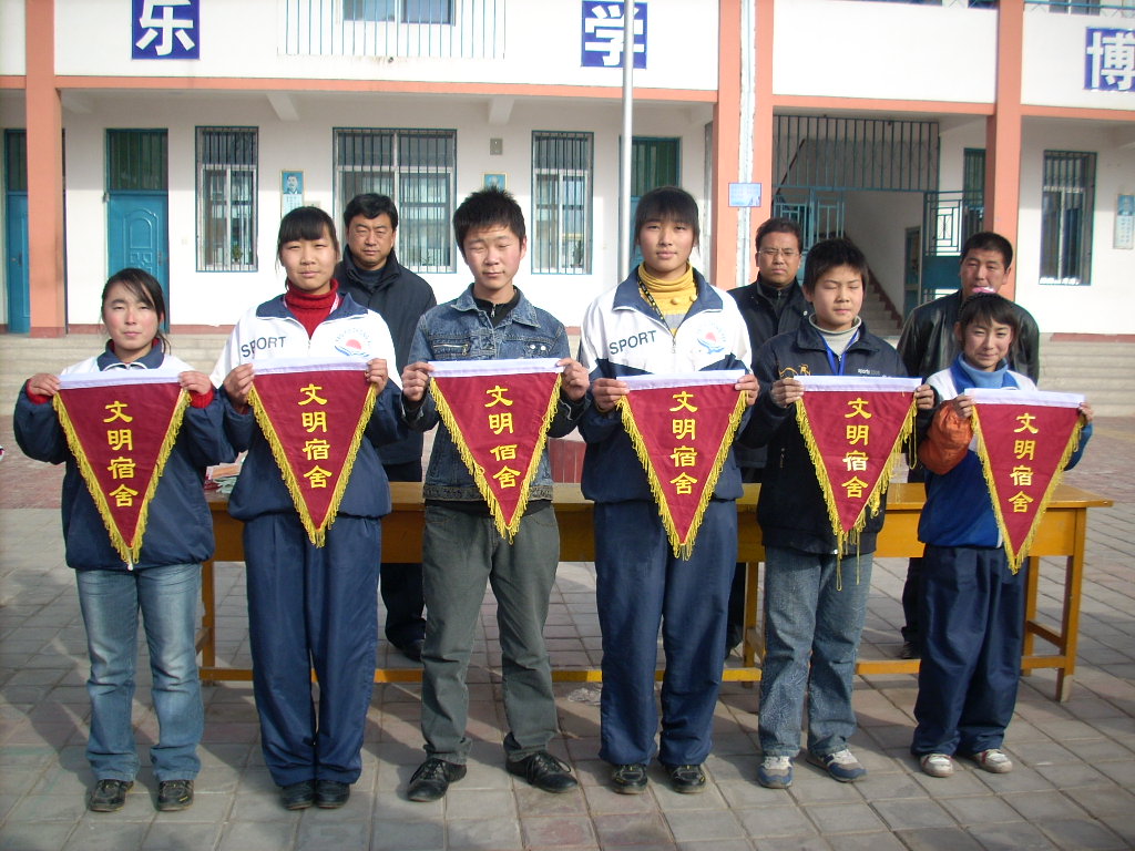我们学校还开展文明宿舍评比活动。每天,有专人负责宿舍的卫生、床铺整理检查,并把检查的结果进行通报,根据一周的检查结果,每周评比六个文明宿舍,这是评出来的六个文明宿舍的社长领取的锦旗。
