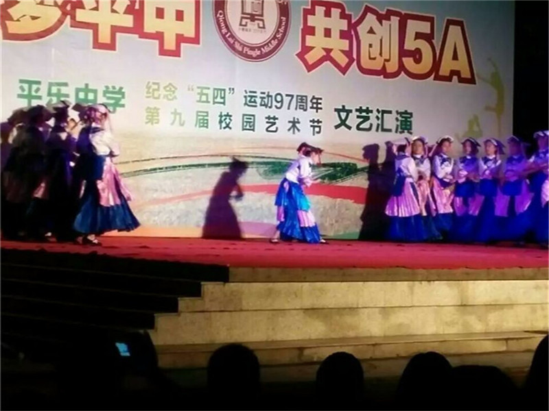 我校位于一个占尽天时地利人和的古镇,这里的风景让人赞不绝口,流连忘返。所以我们要齐心协力的创建一个5A级景区,来彰显我平乐古镇的风采。充满民族风的一个地区当然也要向其他民族学习,所以我校也有民族舞的表演。