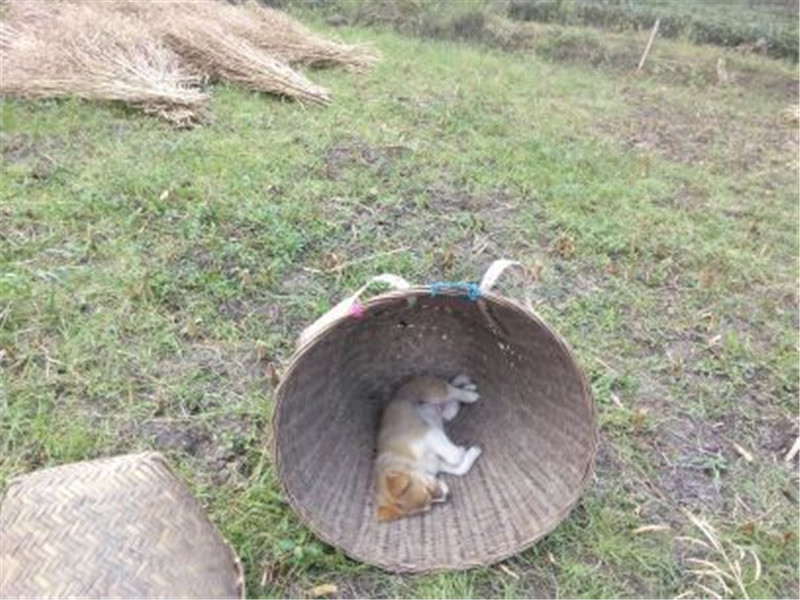 突然地,不经意的一瞥这家伙居然跑到背篓里睡懒觉了。我悄悄地走上前去,本想吓吓它,得,可近了,却又不忍心了。背篓里的它睡得很坦然,没有一点防备。小肚子一上一下地伴随着它的呼吸。再看看它的睫毛,真的很长,眉上的两点小黄点此刻看起来可爱极了。它应该也有很累的时候吧?我脑子里突然疑惑了。正当我转身准备离开时,它居然睁开了眼,但没有要站起来的意思,依旧是平躺着,它的眼睛仿佛在说:"你瞅我干啥?"我的心觉得软软的。