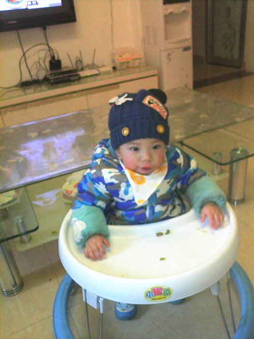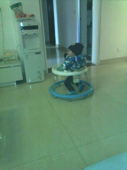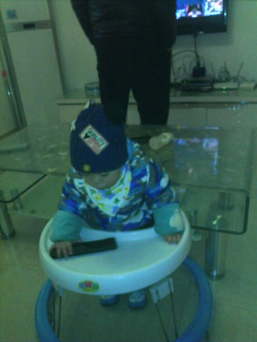 除次之外,他还喜欢看电视,不仅这样,他还爱啃遥控板,凡是有关电器的东西他都喜欢。看!他爸爸正在看电视,他也滑着个车子,吊儿郎当的跟着看,时不时的还看看爸爸是不是在看电视。但这持续不了多长时间,他就一会儿找妈妈,一会儿找爷爷,一会找找奶奶,反正不会消停。如果找到了,就像是发现了什么新机密似的高兴得直笑,如果没找到,他就会哇哇地哭。