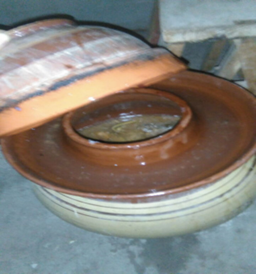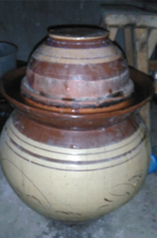 泡菜坛子表面上来看是中间大两头小的瓷坛,中间圆滚滚的像猪八戒的大肚皮,顶端有一个小圆口,圆口下边约20厘米处有一道圈(我们这儿叫坛塀子),上面有一个盖子,一般的泡菜坛子都是由陶瓷做的,陶瓷做出来的坛子泡的菜保存得久而且不易坏。