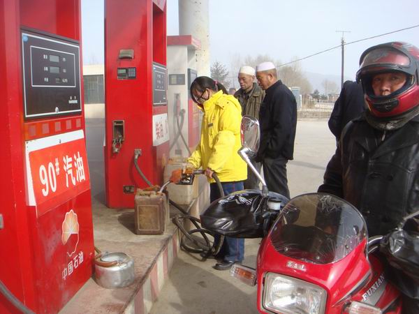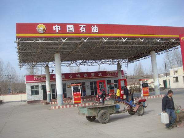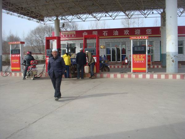 时值冬季,大雪压来。加油站里的人也多了,里面储存的油也多了,主要方便附近的老百姓的经济发展。你看,这辆手扶拖拉机里面装着很多油桶,主要是来给自己家里储存跟多的油。