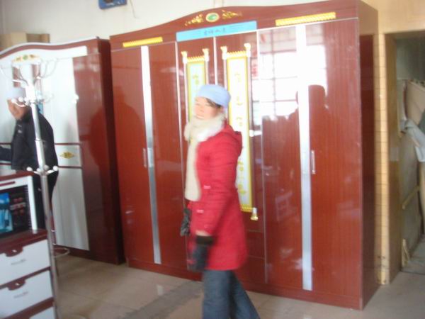 大家看到的这个立柜,就是这个家具店老板自己做的,看起来它很大方而且实用。我们这里的人选家具主要看它的实用,不看它的外观。你瞧,这位阿姨就在这个立柜面前,感觉到不错,就有买它的想法。