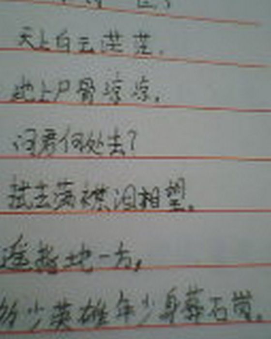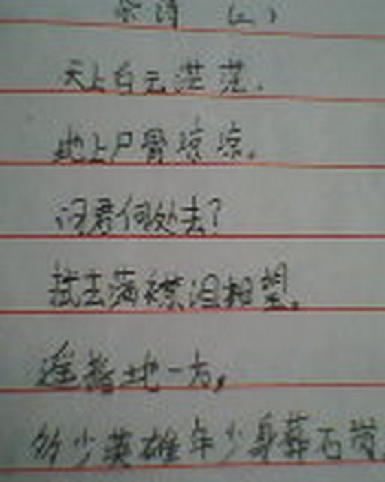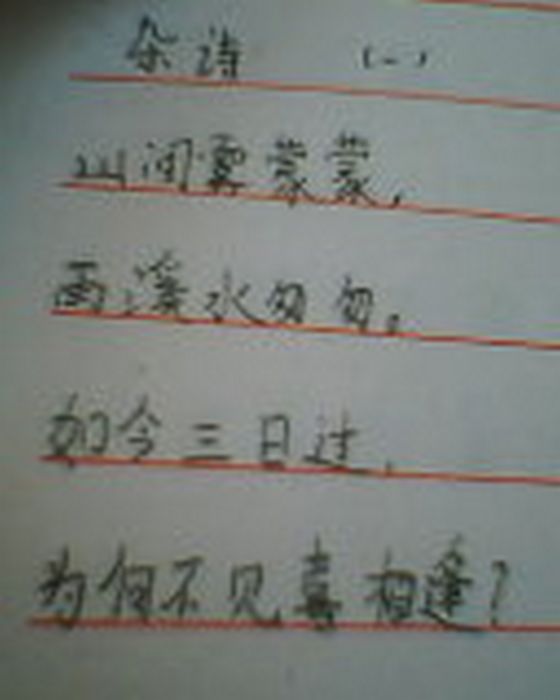 现在,我写的"诗"的时间不多,但也为了让学生生活不那么枯燥、紧张,我有时也写了一些古怪的诗。什么"读书悔",但这不是为读书而后悔,相反这是为了没读好书而后悔。这不是工夸大其词,我也给同学们"秀"过几眼,她们大多数对我的"诗"没多大意见,都说我写得有趣,与此同时,也将我诗的优点与不足提了出来。我对此高度重视,并进行了自我总结。