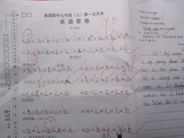 我的英语成绩虽然是居现在班上的第一名,但是在其他几个班级里还有比我的分数高的人。我的英语听力也错的有,以后我还要多练习我的英语听力。英语阅读也错了几个,因为这是一个长篇阅读,我的阅读还有一个是马虎出错了,我以后还需要多练习英语试题。
