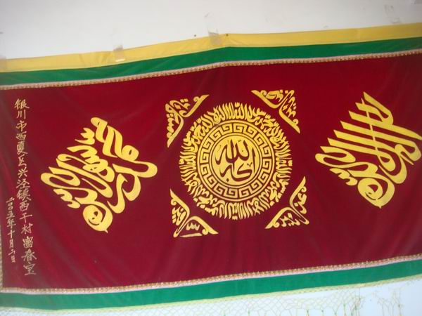 走进清真华寺,映入眼帘是殿堂内横挂着的一面旌旗,是用阿拉伯文写的,是信仰伊斯兰教通用的一种文字,是伊斯兰教传入中国的一个象征。这面旌旗是银川市西夏区清真寺赠送的,以表示对清真华寺的祝贺!