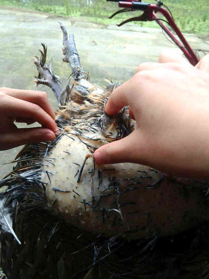 因为中途大姑爷有事要先走,所以剩下的事就该我们几个小孩来完成。不过是拔毛吗?这有何难,看我的厉害。不过刚拔了几分钟,我就有点认怂。不是拔鸡毛吗?为什么这下面还有一种乳白色的东西?为什么这东西还这么多?为什么这东西还引起了我的密集恐惧症?oh,my god!终于,在我的不懈努力下,毛终于拔完了。