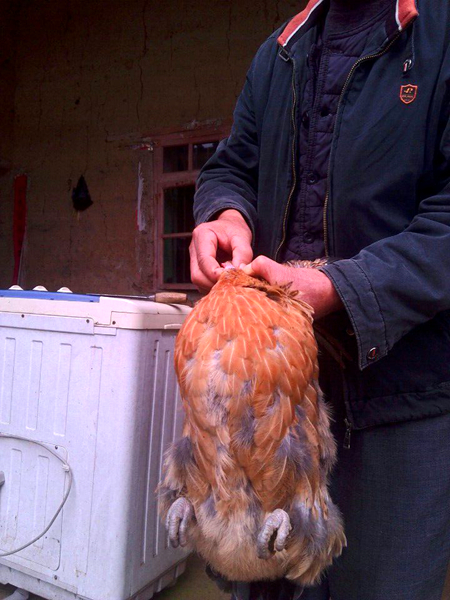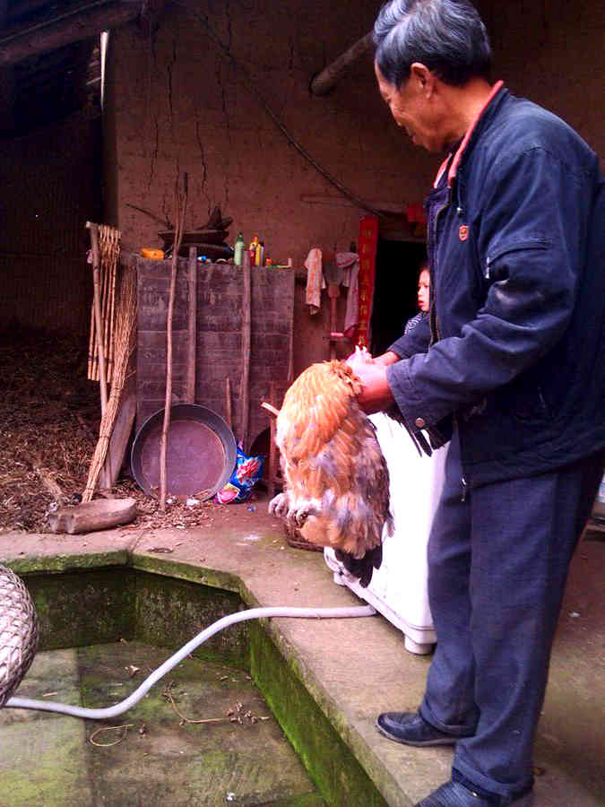 大姑爷先从鸡圈里挑了一只很大的母鸡,听大姑爷说,它不能下蛋了,所以才要被我们吃掉。唉,小鸡,让我为你默哀三分钟。