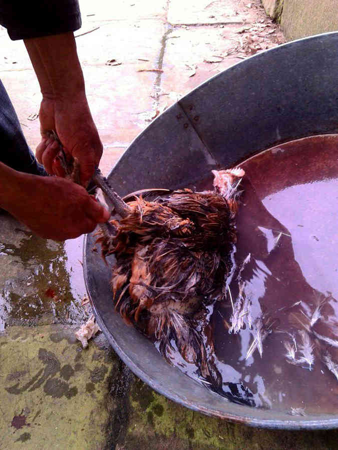 第一个步骤就是把鸡给抹脖子。听起来好残忍。先将鸡脖子上的羽毛撩开,然后又用刀将血管给割破。然后等放完血后,就放入烧沸了的水中。这样鸡的羽毛就会被烫掉,不过,羽毛是那么容易就被消灭的吗?呵呵,那是不可能的。其中,这最大用处就是方便我们拔毛。没错,就是我们!