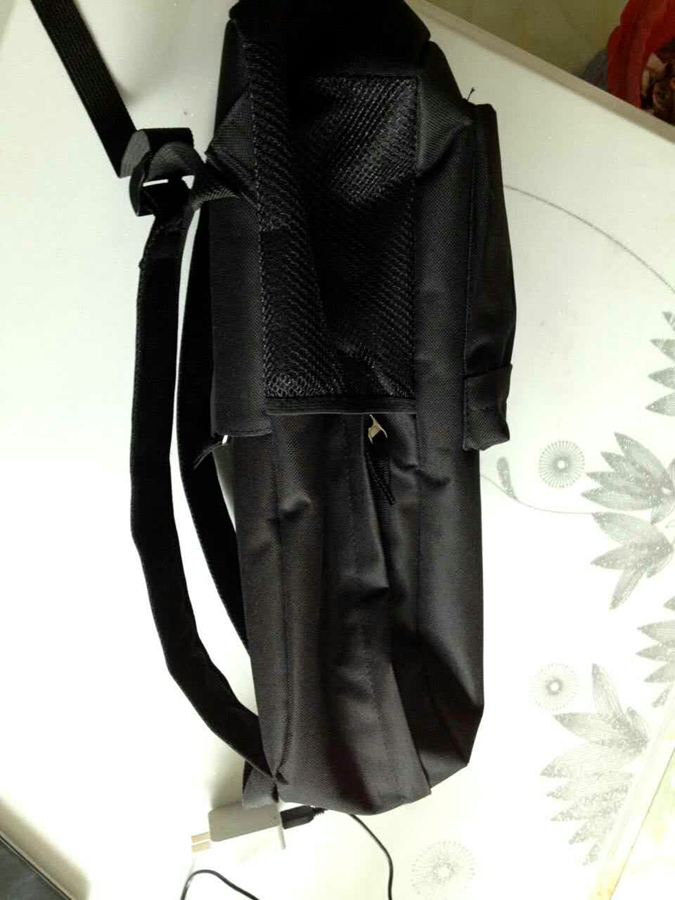 这是个以黑色为主色调的双肩背包,只有印的字母和一些图案才是白色的,这个书包的外层有一个小袋,它只有整个书包的三分之一,上面印有MUSIC字样,在这个小袋里装上放音乐的手机、MP4刚刚好,而且拉链没有露在外面,有一个折痕可以掩盖拉链,这样就可以防备东西被小偷偷走了,设计还真挺人性化的。书包的两侧各有一个网兜,这个可以装雨伞和水瓶,真的是考虑得太周全了。