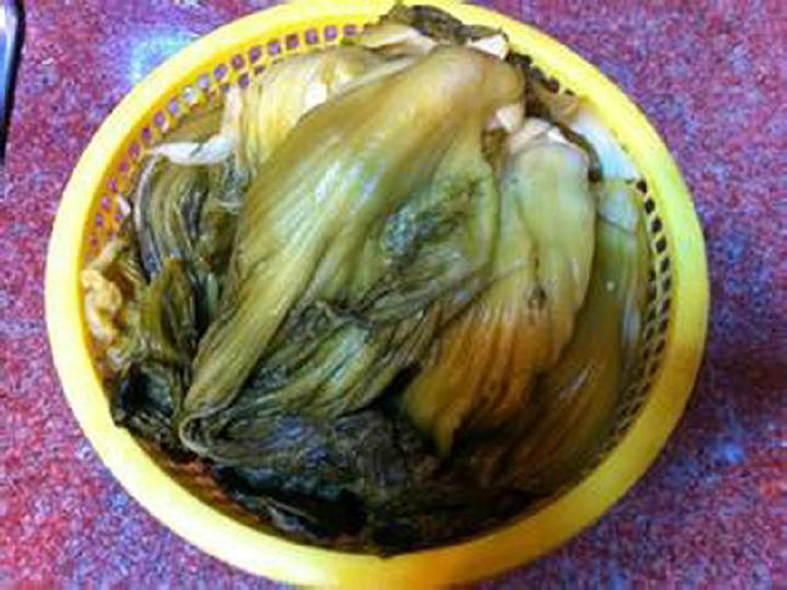 这些基础工作做完了,现在就是黄豆和酸菜华丽变身的时候了。首先取一些干木柴,把木柴放入柴火锅中烧上一大锅的开水。滚开后就可以把我们晾的青菜叶分批慢慢放入水中烫煮,这时动作一定要快。把菜叶在开水中烫到4成熟时捞起,把多余的水再次滤出。然后将烫好的菜叶放入事先准备好的瓷缸中。现在酸菜能不能做成就看这最后一步了。首先把陈年的干酸菜按比例拿出来放在锅中用开水熬1小时。然后将酸菜渣捞出,将酸水冷却。将冷却了的酸水倒入装有酸菜的坛子里,直到将全部酸菜淹没为止。最后将酸菜紧紧按实,最后把缸盖上盖子,这是为了防止微生物滋生或空气进入,有时还需在坛口铺上干净的塑料口袋,最后在坛沿边上参入清水。现在,我们就开始等待时间赋予给酸菜新的生命力。