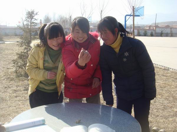 小沙包高起来的时候,这下就看你自己的手感了。如果沙包落地,你下面的羊骨头还没翻好,那你就赶紧动手吧!因为你将马上完蛋了,沙包落地你的动作没完成,就说明你已经输了,瞧!我们班这女生玩的多么的投入呀。