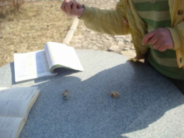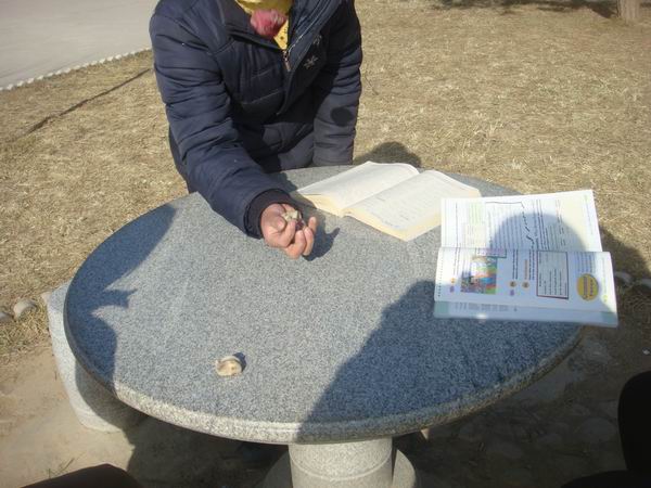 我们在这美丽的校园,一边学习,累了玩一会羊骨头。舒缓一下我们紧张的学习压力,这样的话,我们可以即学到知识,又可以玩好,在这花园的石桌上我们是开心的、幸福的。