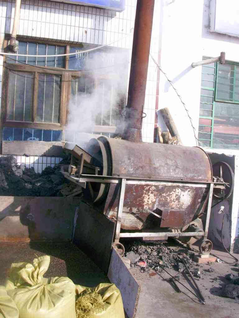 这是用来炒胡麻的炉子,因为胡麻炒熟以后榨油的时侯才能很好地出油。这种炉子能在加热过程中自动旋转,使里面的胡麻籽能均匀受热。