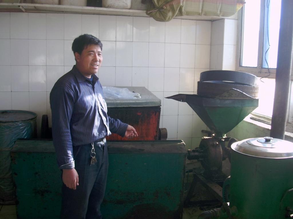 这就是油房的主人巴老板,他告诉我现在看到的机器就是粉碎机,将炒好的胡麻倒进去粉碎后按比例加水搅拌并放置一段时间后就可以上机子压榨了。