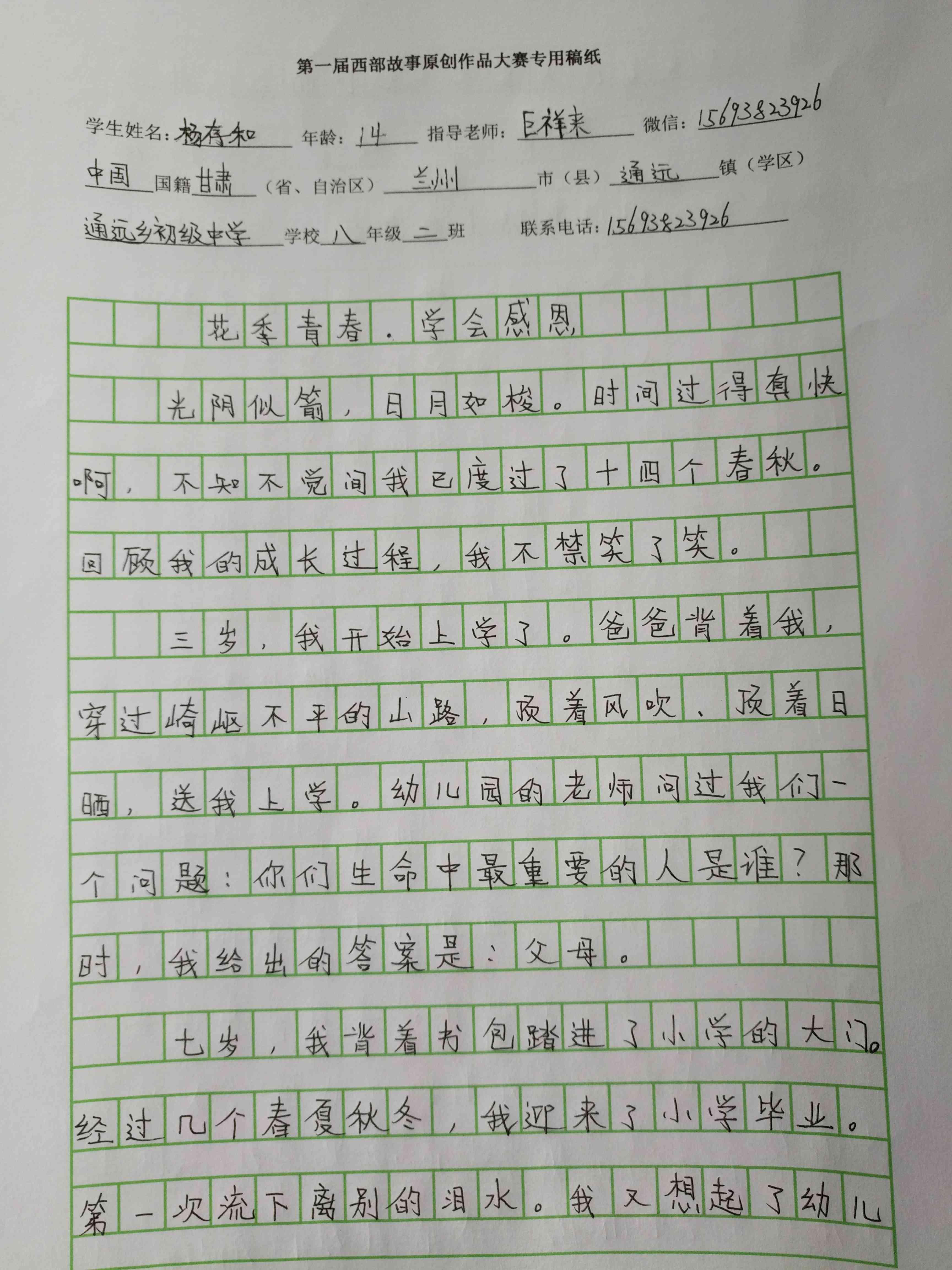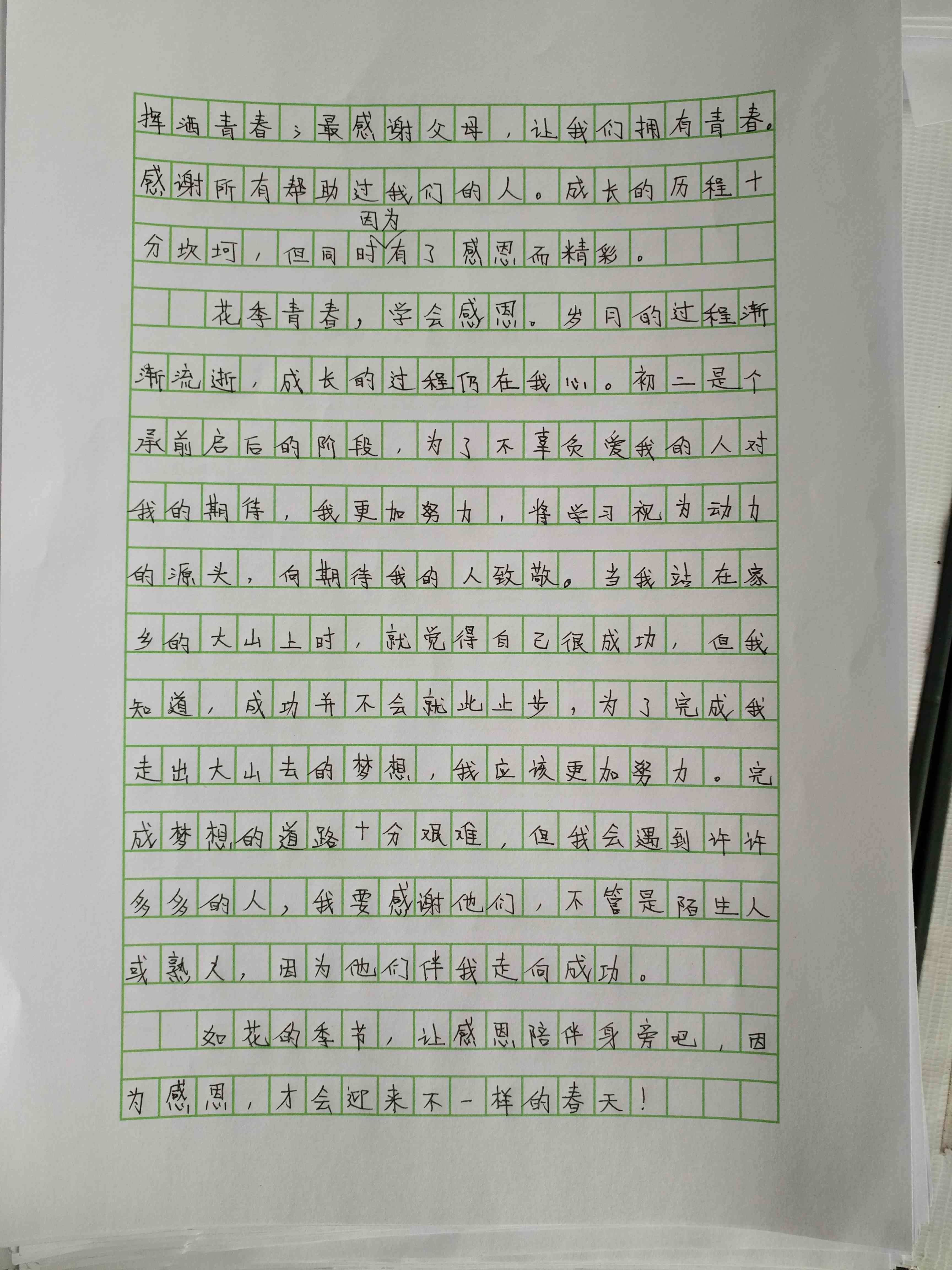 花季青春,学会感恩。岁月的过程渐渐流逝,成长的过程仍在我心,初二是个承前启后的阶段,为了不辜负爱我的人对我的期待,我更加努力,将学习视为动力的源头,向期待我的人致敬。当我站在家乡的大山上时,就觉得自己很成功,但我知道,成功并不会就此止步,为了完成我走出大山去的梦想,我应该更加努力。完成梦想的道路十分艰难,但我会遇到许许多多的人,我要感谢他们,不管是陌生人或熟人,因为他们伴我走向成功。