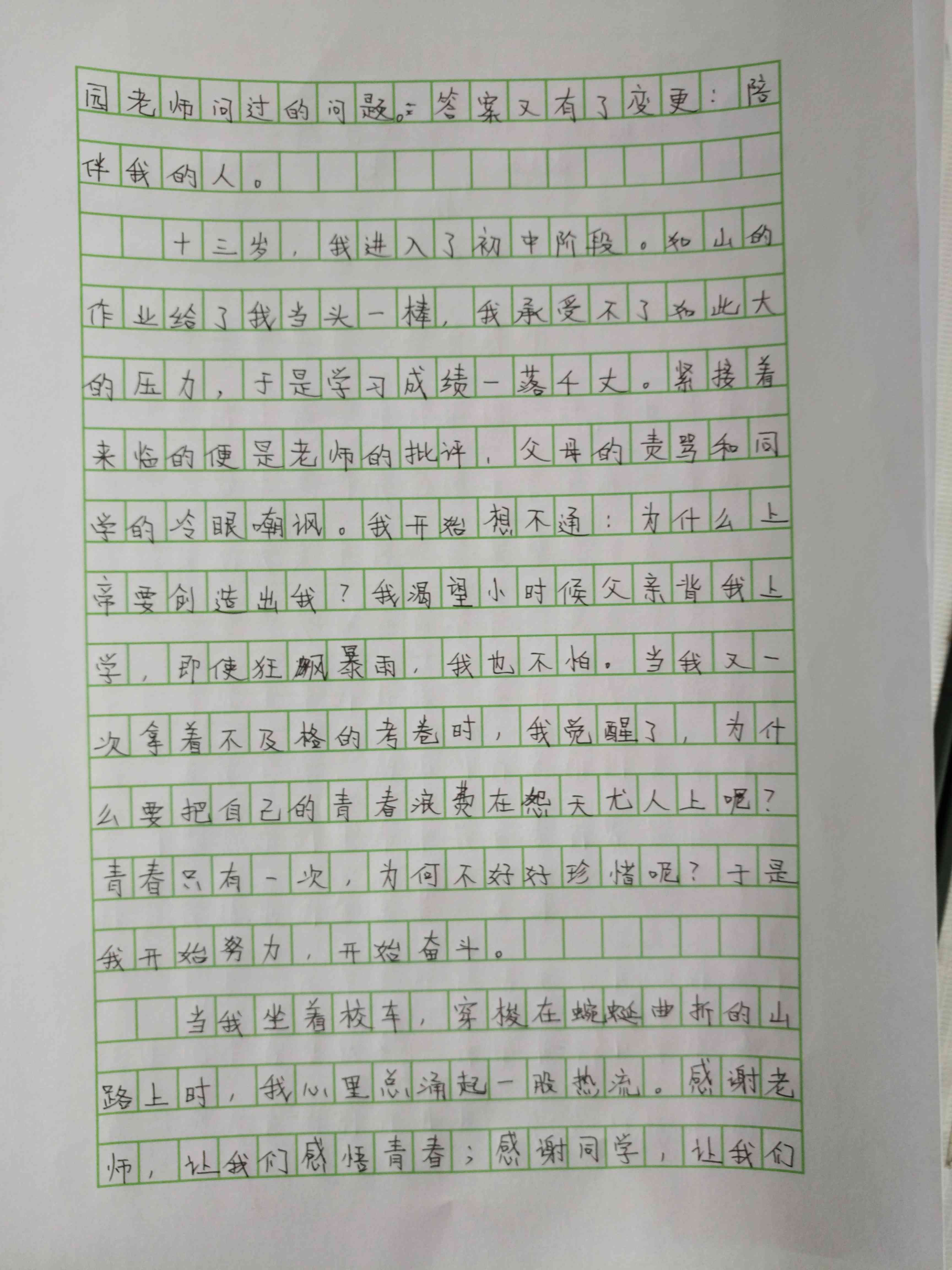 当我坐着校车,穿梭在蜿蜒曲折的山路上时,我心里总涌起一股热流。感谢老师,让我们感悟青春;感谢同学,让我们挥洒青春;最感谢父母,让我们拥有青春。感谢所有帮助过我们的人。成长的历程十分坎坷,但同时因为有了感恩而精彩。