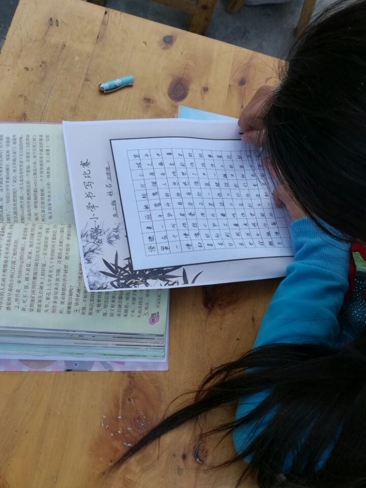 我出师不利,写第二个字就错了,我把"晚"的"免"写成了"兔",我连忙拿起修正液,刚想起刘玲老师说:"错了就错了,不要去改,免得不好看"所以我把修正液放回原处。我又开始了我的写字之旅,我扭头一看,呀!张湘比我写这么多了,我连忙加快速度,我的手臂开始发酸了,王老师走过来说:"不要慌,慢慢写"我的手已经出汗了,不仅速度慢了起来,而且字写的也不是很好了,那时我的手在发抖。写了一会儿,突然老师说:"写好的可以拿上来了"我扭头一看张湘早已写完了,已经交给老师了,当时我还有一排没有写完,我感觉看到了希望,我越写越快终于写完了,看见夏老师走过来,我就把作品交给了夏老师。