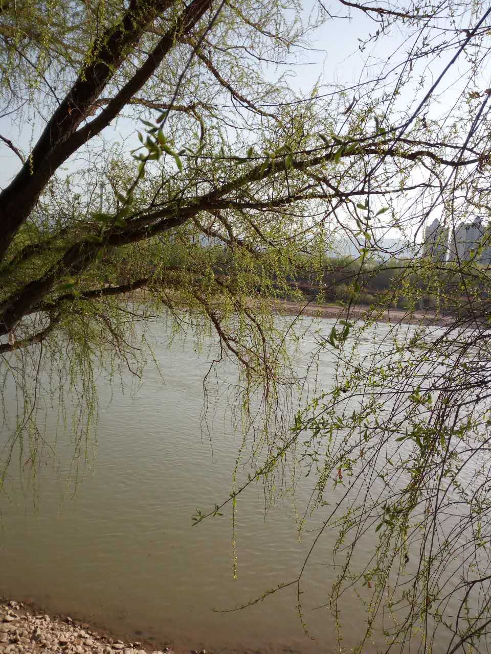 在我眼中,她是美丽的:春天,河边的柳树悄悄地抽出了嫩芽,随着东风飘摇;夏天,河边郁郁葱葱的树木伴着夏日傍晚的微风,吸引着人们的脚步;秋天,叶子黄了,花儿谢了,凋谢的花瓣与树上的黄叶一起落入水中,在水中飘荡;到了冬天,河水变成了绿色,绿色的水和蓝色的天相映成趣。