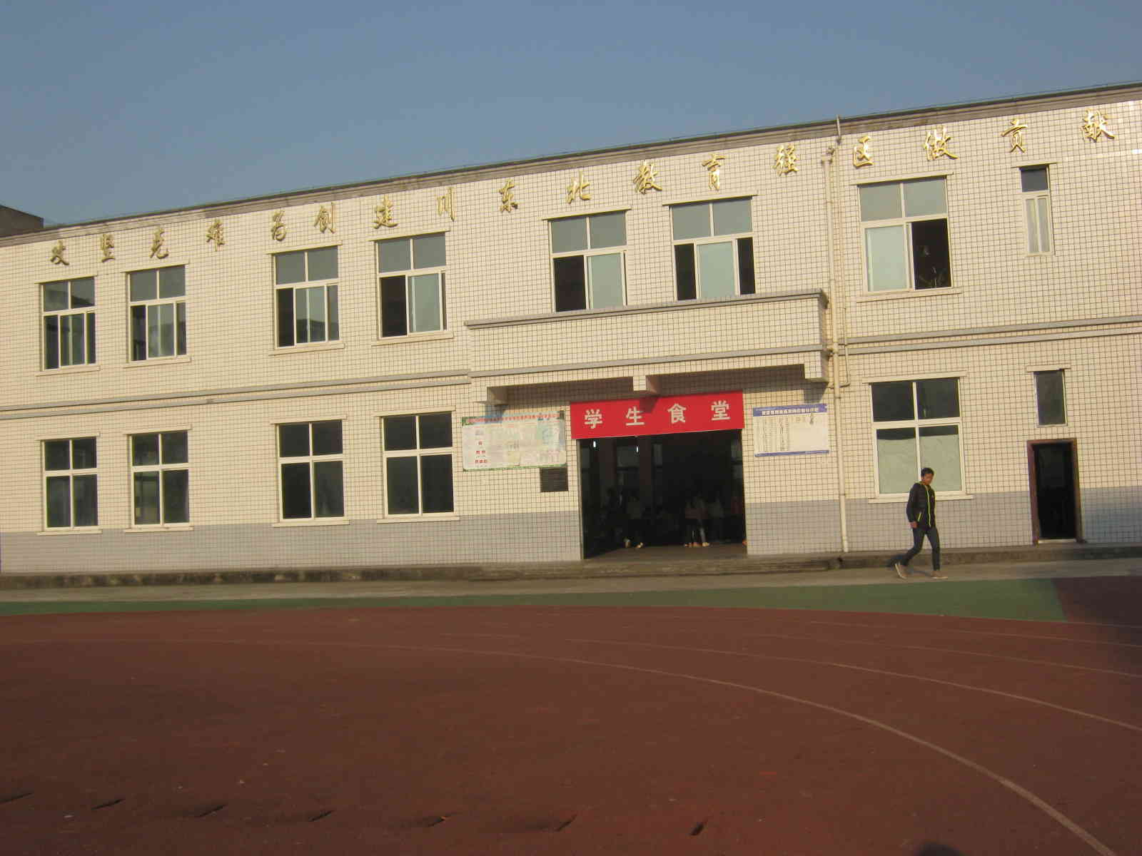 再往左看,别致的综合楼中间富丽堂皇的办公楼是老师们办公的地方。这三栋鳞次栉比的楼,唯独办公楼颜色不一样,同时突出了这栋楼的与众不同之处。在它前面有一个舞台,是学校领导发言的地方,同时也是升国旗的地方,这个地方一直很神圣! 在乒乓球台前面有一个宽敞明亮的食堂。食堂只有两层,一层是学生食堂,另一个是教师食堂,食堂里的餐桌摆放一致,看起来很舒适。 再看看食堂对面的宿舍,那是我们另一个家,清静的环境能让我们安然入睡,让我们第二天精神抖擞。宿舍楼也是五层,好像是因为以前这个地方不那么富裕,有许多学生的家离这里太远,所以住宿生就比较多,现在没有那么多了。