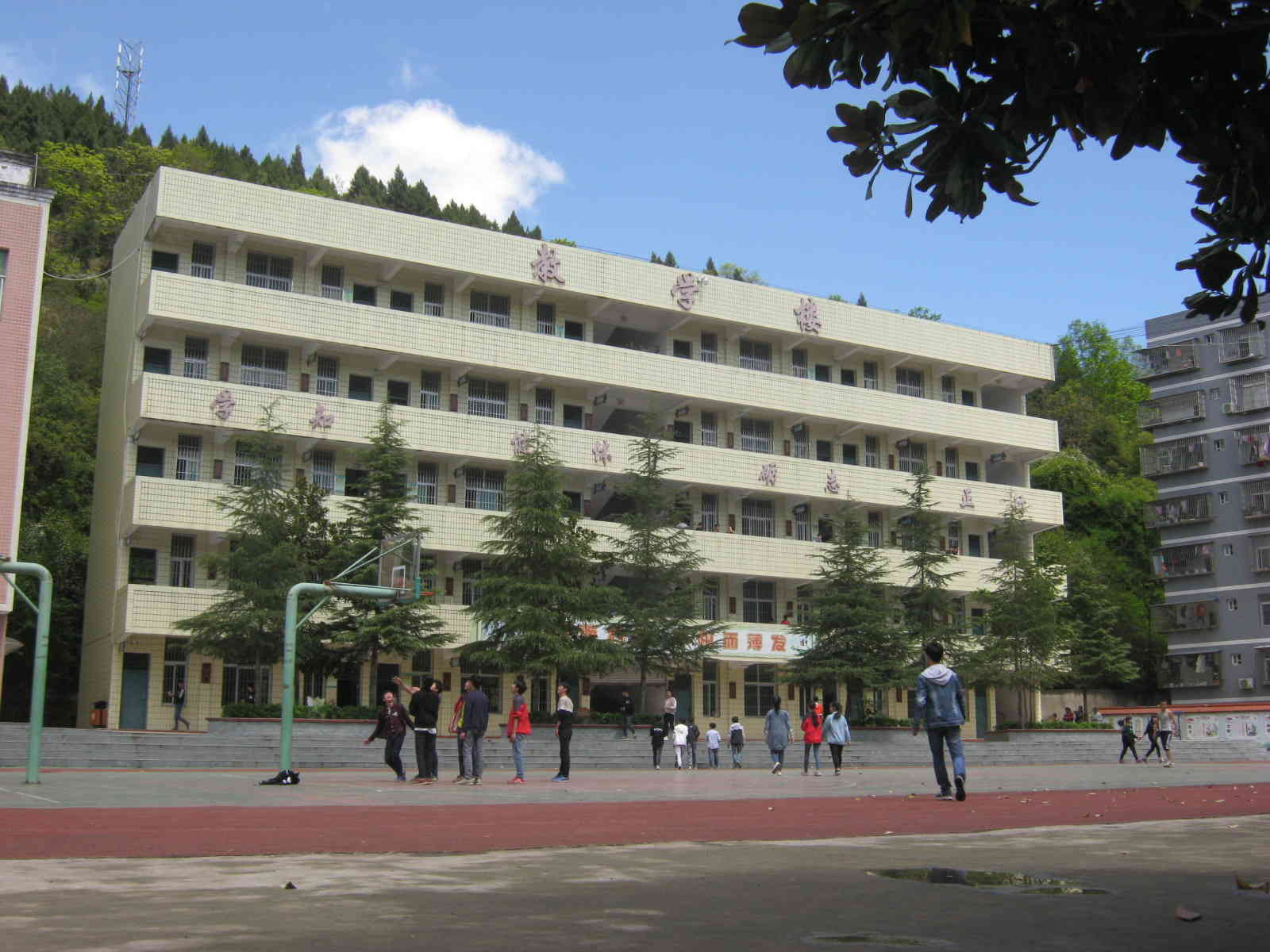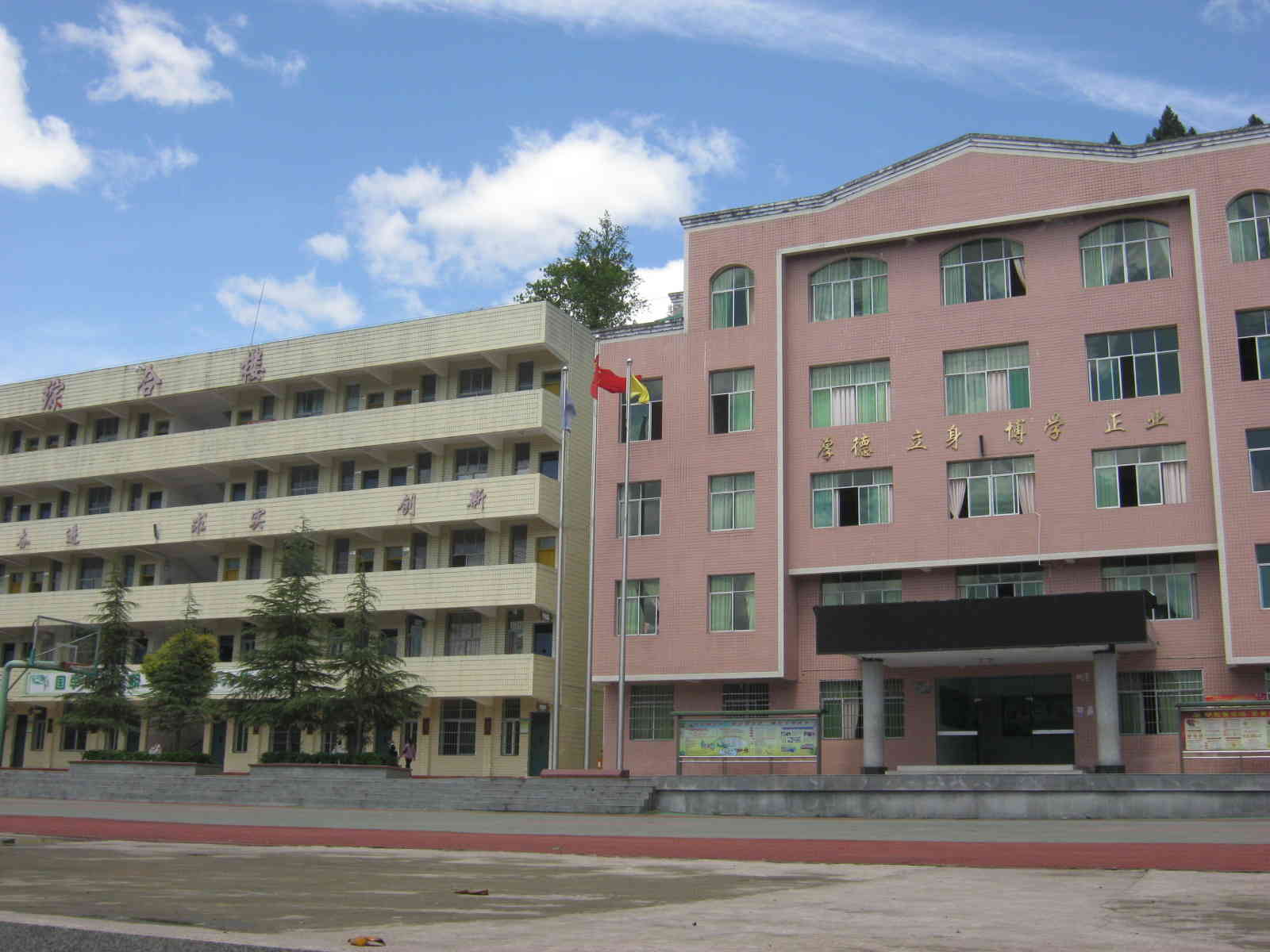 笔直地往前走,几个花坛点缀着神圣的教学楼,几棵高大挺拔的青松像一个个昂首挺胸的侍卫一样保卫着教学楼。教学楼共五层,现在全校大约有500多名师生,只占了三层楼的教室,还有两层楼一直空着。以前学校共有1000多人,教学楼没有一间空教室。